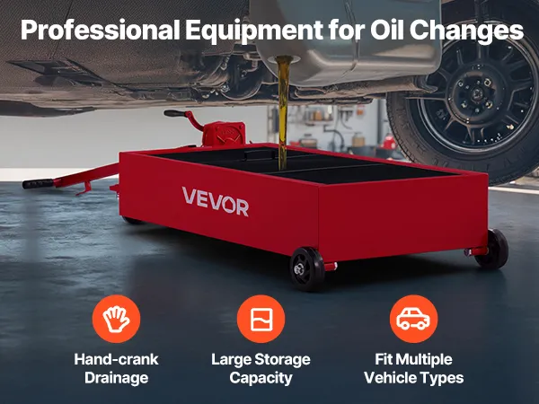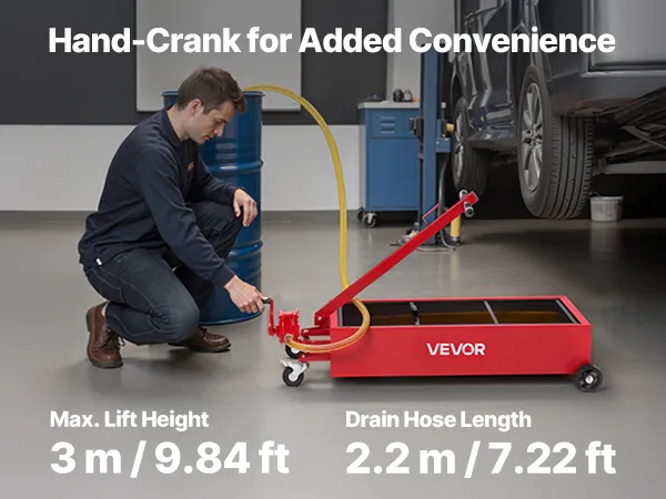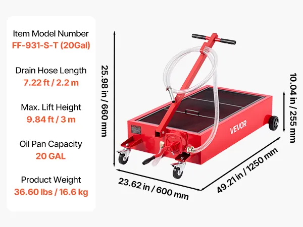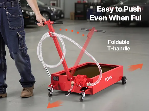 This 20-gallon low profile oil drain pan makes oil changes easy without jacks or heavy lifting. The pump system replaces repeated pouring, while the foldable T-handle and durable wheels ensure smooth movement. Ideal for garages, farms, and workshops.