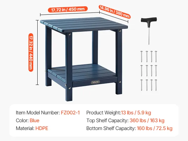 VEVOR Outdoor Side Table, 17.72W x 14.96D x 17.32H Inch, Double Layer HDPE Outside End Table for Easy Maintenance, Withstand Harsh Weather, Fit for Patio, Pool, Beach, Porch, Indoor, Backyard, Blue