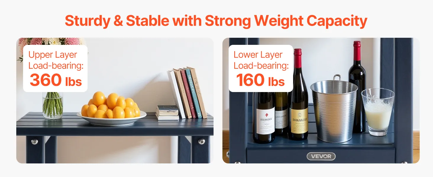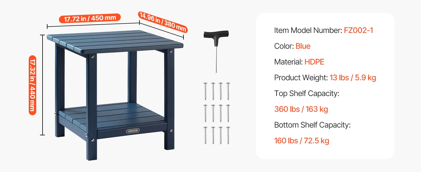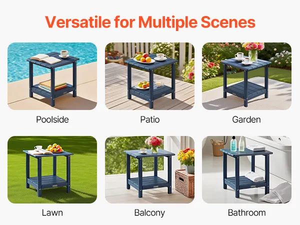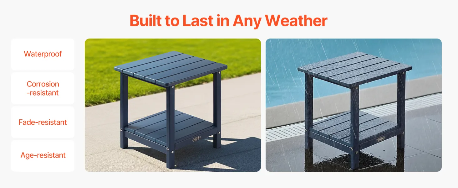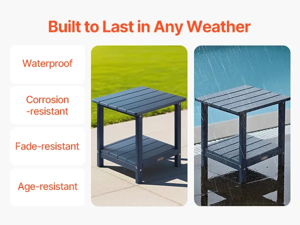 Crafted with high-quality HDPE material and a solid H-frame structure, this outdoor end table offers excellent strength. The top can hold up to 360 lbs, and the bottom shelf can support up to 160 lbs.