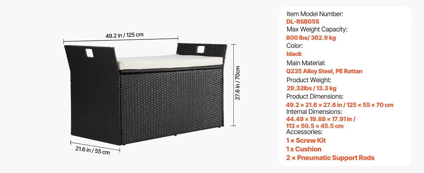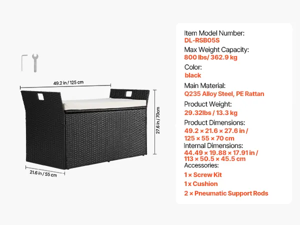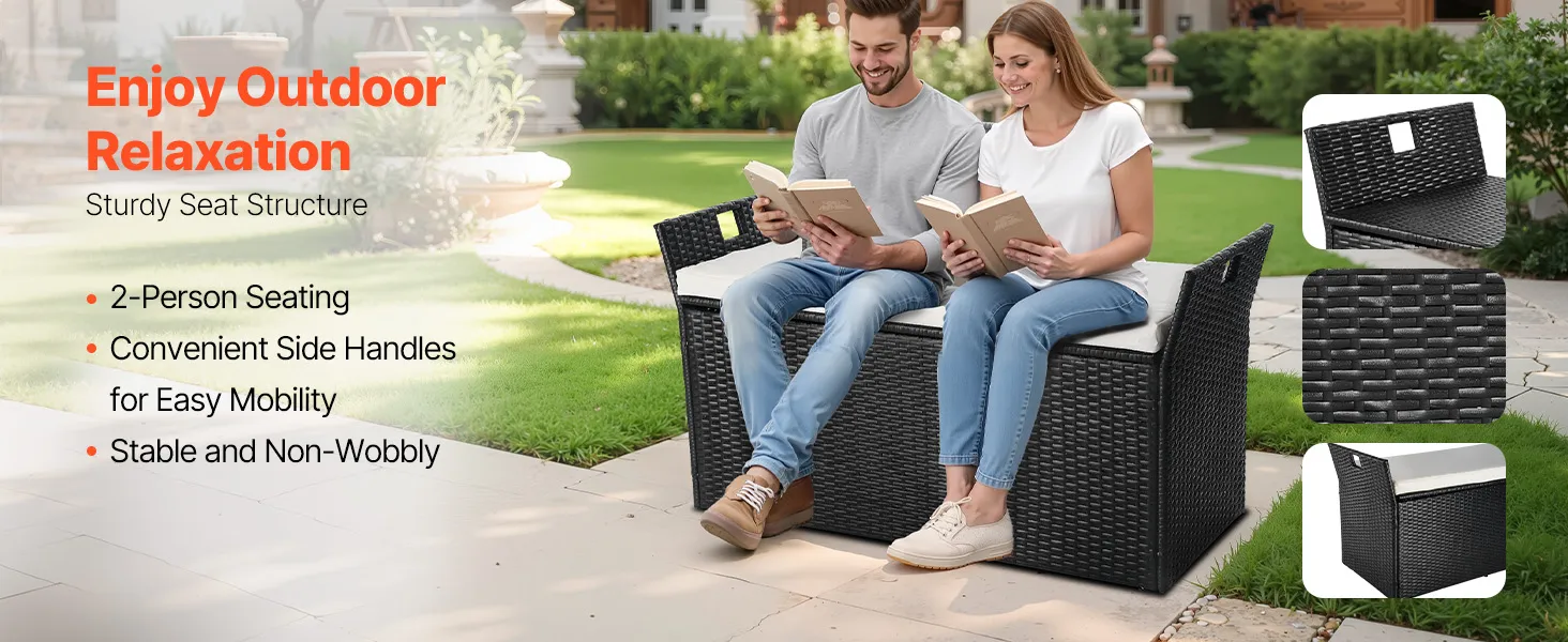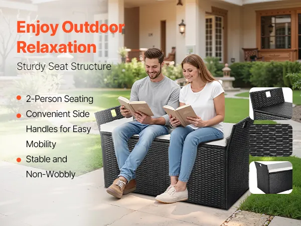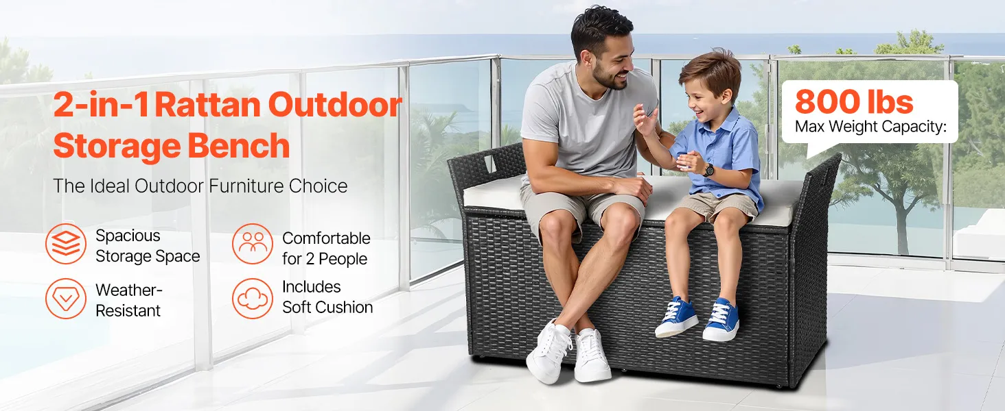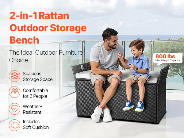 This outdoor storage bench with internal space of 47.2×19.7×10.2 in, serves as a comfortable seating for two and store outdoor essentials, keeping your space neat. Built with a sturdy alloy steel frame that supports up to 800 lbs, and weather-resistant PE wicker, it resists sun, rain, and fading.