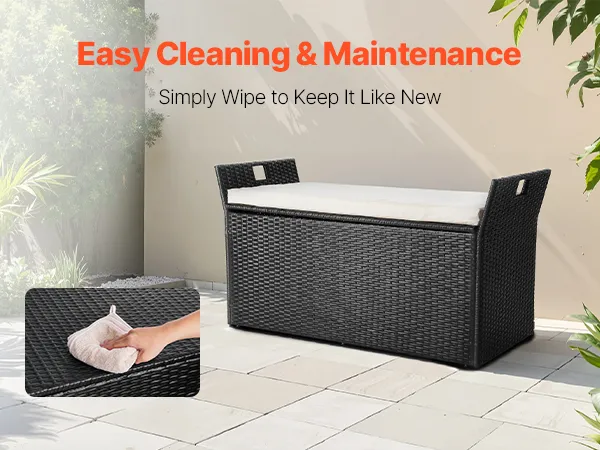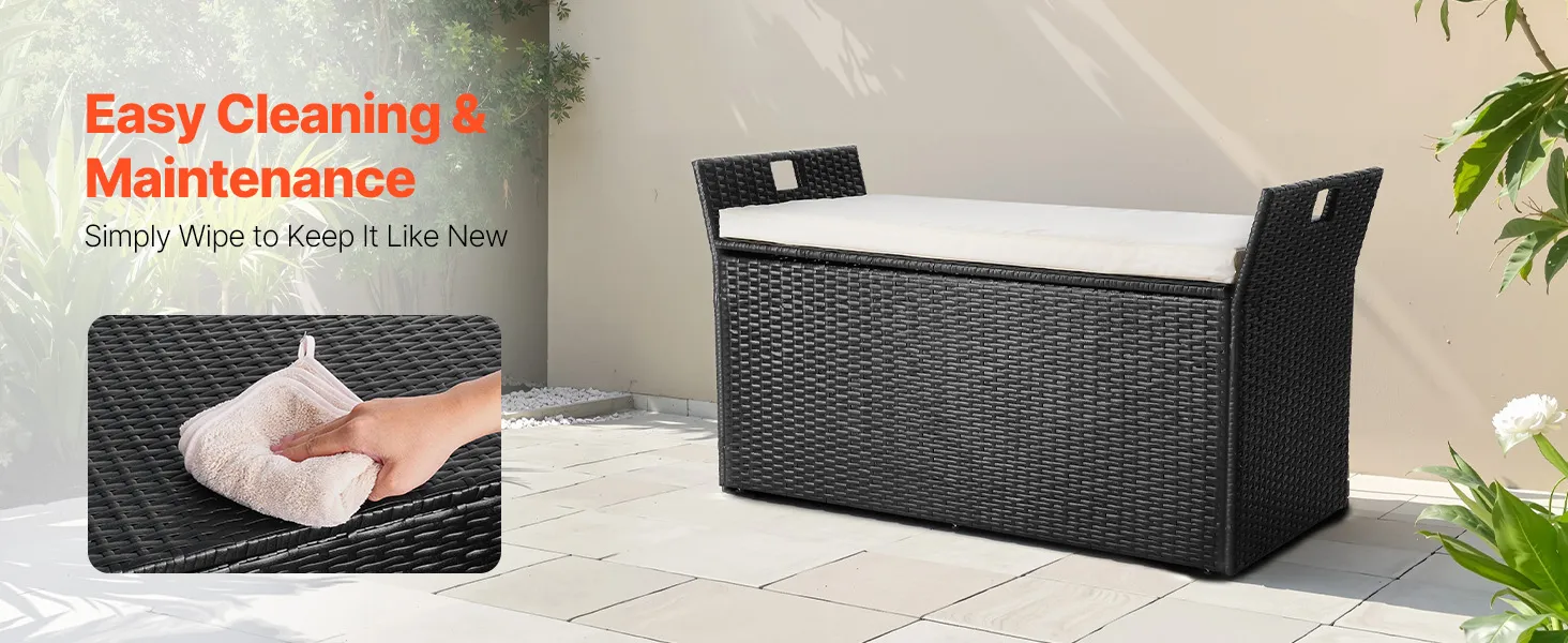 Constructed from high-quality metal and PE wicker, the deck box bench is resistant to fading and cracking. Its surface is easy to clean with a damp cloth, requiring minimal maintenance while maintaining a clean and tidy appearance.