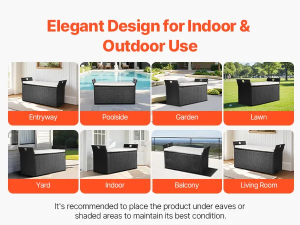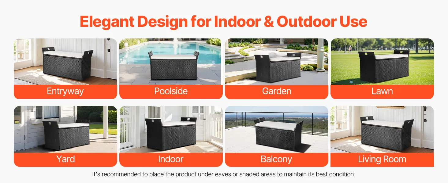 Versatile & Elegant Design: Its sleek and functional design fits in various indoor and outdoor settings, including gardens, patios, and poolside areas. The outdoor bench with storage adds both practicality and aesthetic value to your outdoor living space.