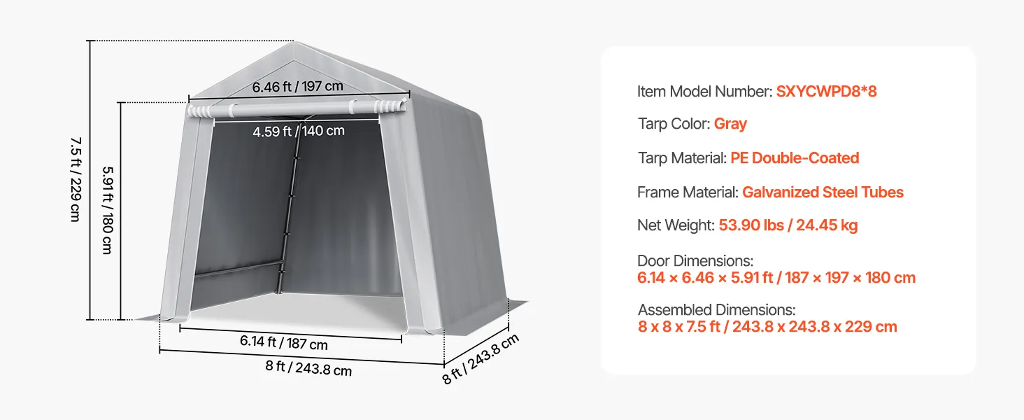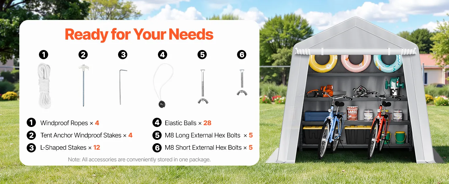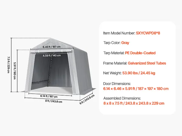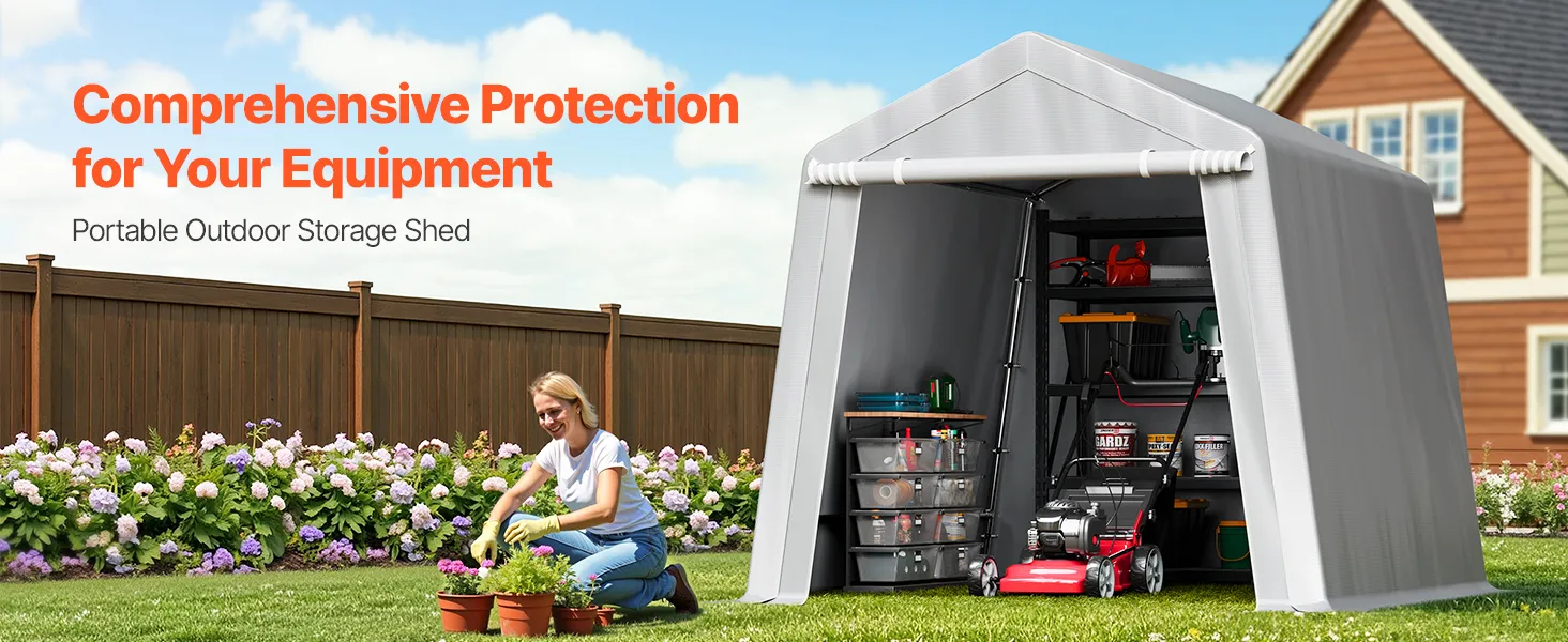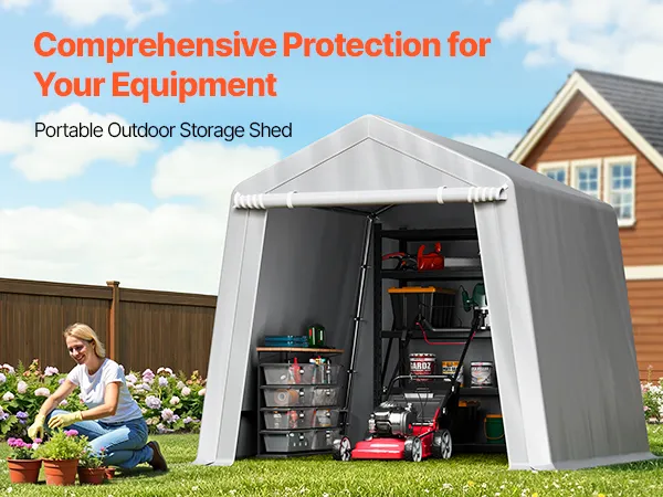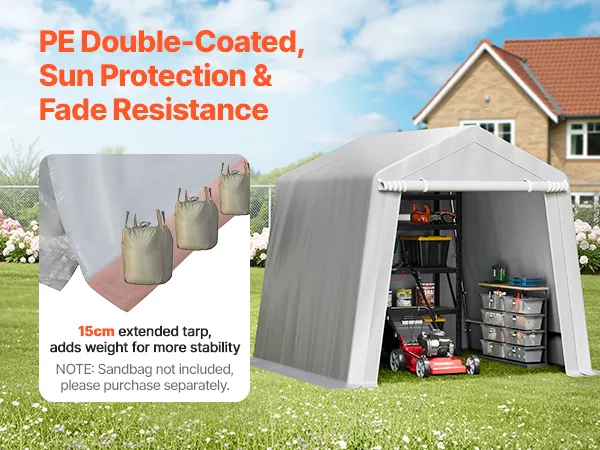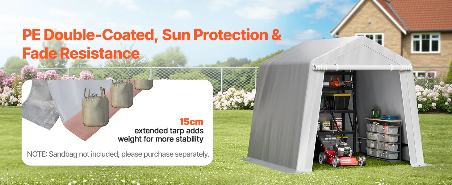 PE Double-Sided Coated Canopy: The outdoor storage shelter comes with a gray cover that is made from double-layer coated PE material, offering tear resistance, fade resistance, rain and snow protection, wind and dust resistance, and UV protection. The bottom extends 5.91 inches (15 cm) to the ground, improving stability and protecting your equipment from harsh weather.
