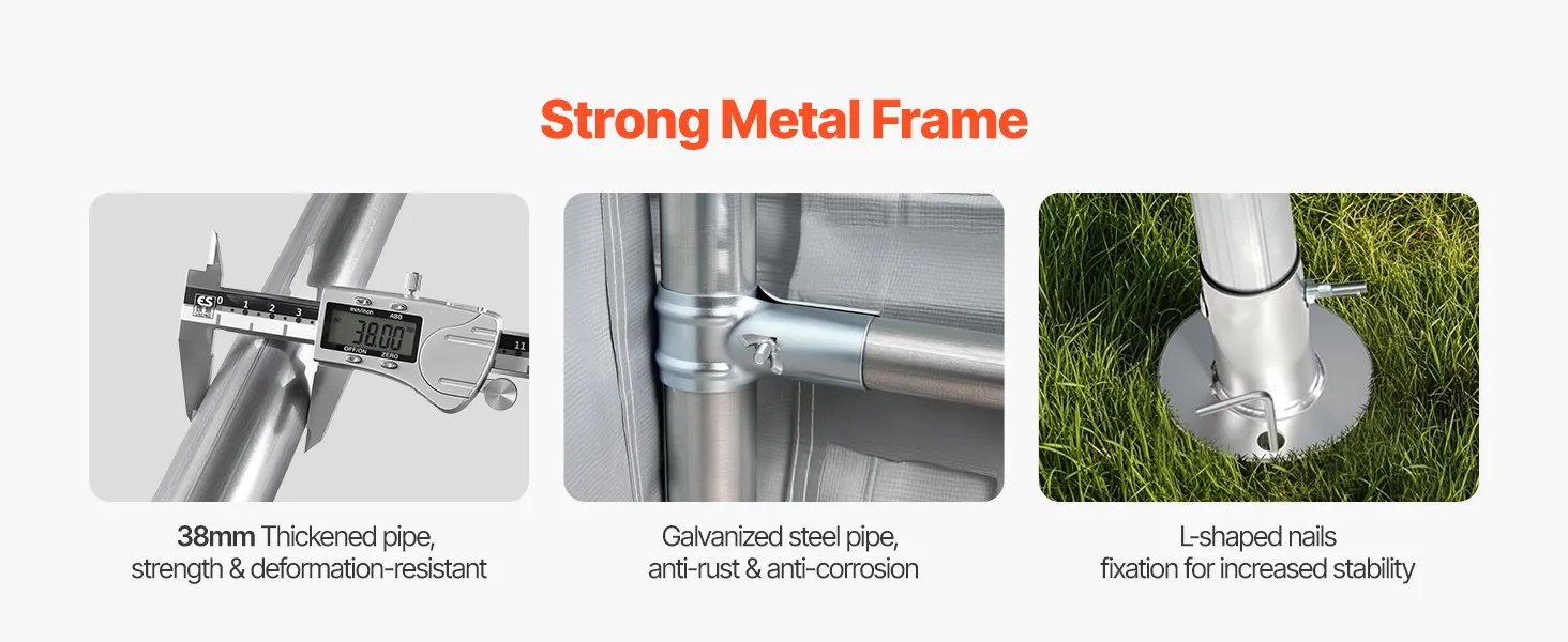 Heavy-Duty Metal Frame: This large 8x8 ft portable storage shed is built with galvanized steel pipes, with a pipe diameter of 38mm and wall thickness up to 0.7mm. This makes it resistant to cracking, peeling, rusting, and corrosion, ensuring stability and security even in harsh weather conditions.