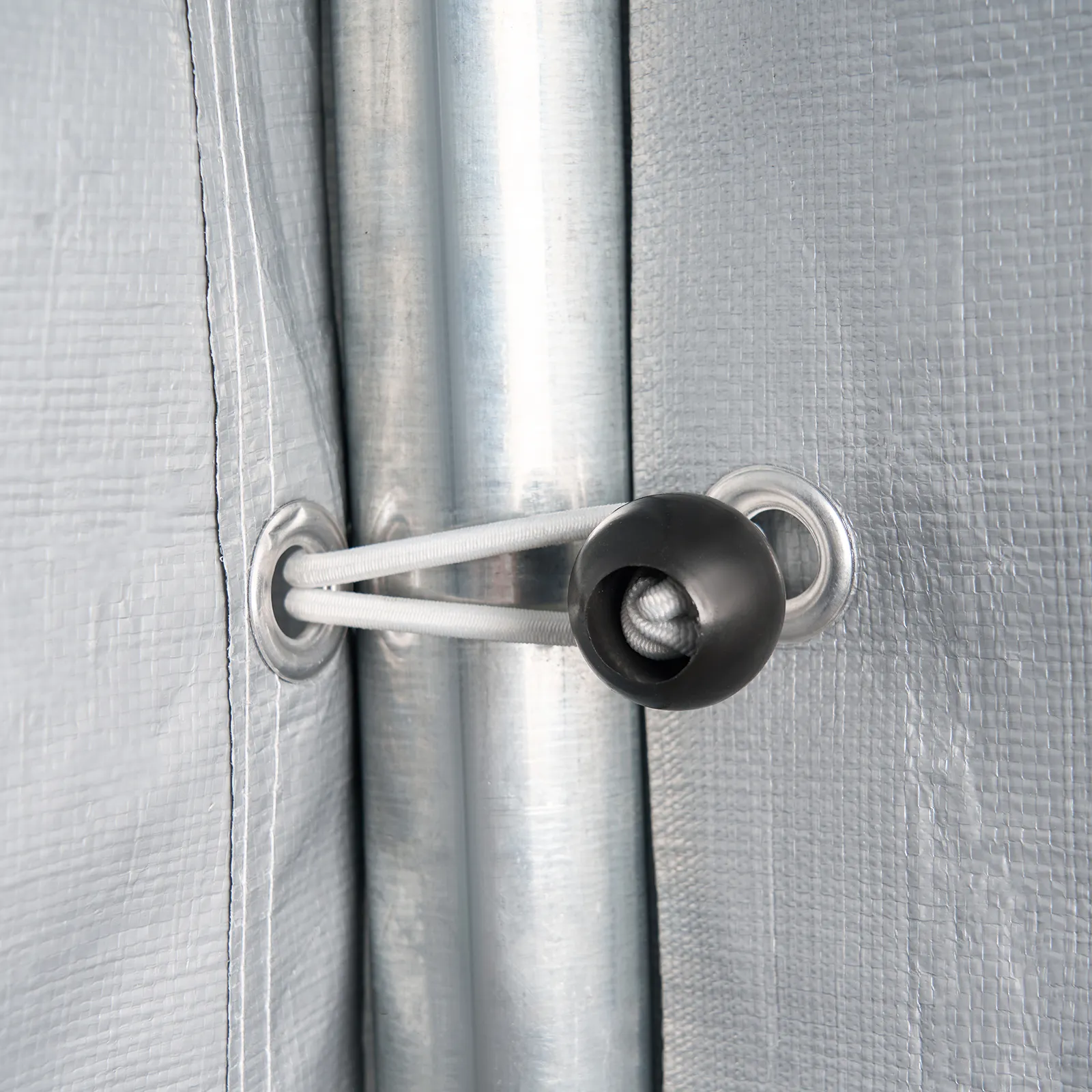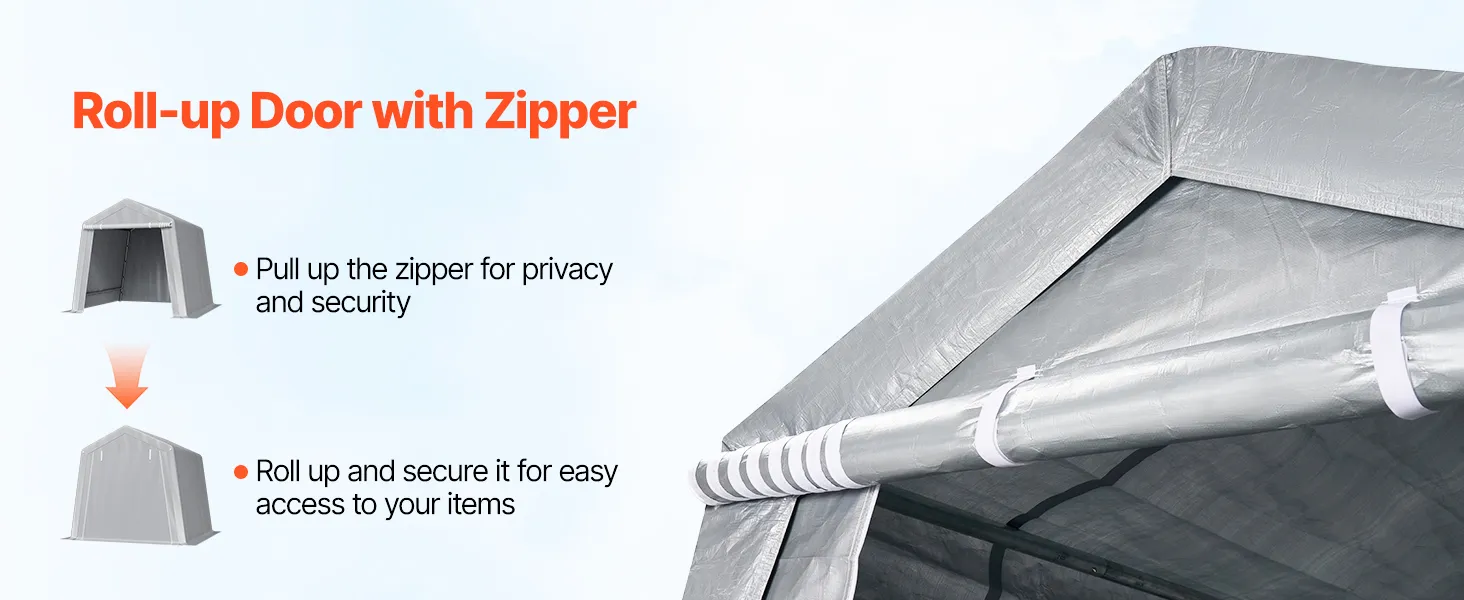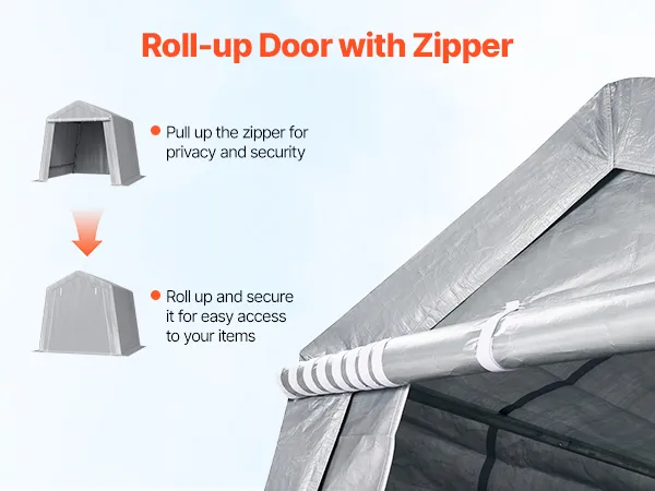 Zipper Door Design: Flexible to seal or roll up. When sealed, the zipper fits snugly, fully protecting your items from dust, moisture, and other external factors. To access your items, simply roll up the zipper door for easy and quick access to your canvas storage sheds.
