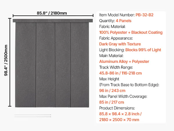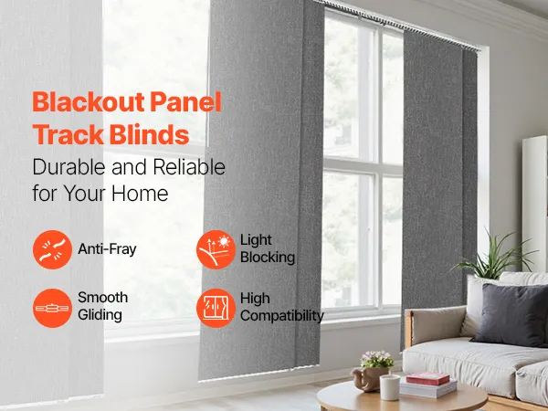 Crafted from durable polyester fabric with a blackout coating, these panel track blinds block 99% of light for privacy. The top valance elegantly hides the track, creating a sleek look. They are ideal for patio doors, large floor-to-ceiling windows, and more, ensuring both style and function.