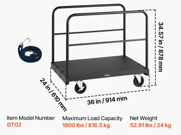Stable Base with Strap: Measuring 36 x 24 x 33.8 in, the wide deck has non-slip texture to avoid sliding. At 53.6 lbs, our drywall sheet cart is sturdy and reliable. A bonus bungee strap keeps items secure without extra tools