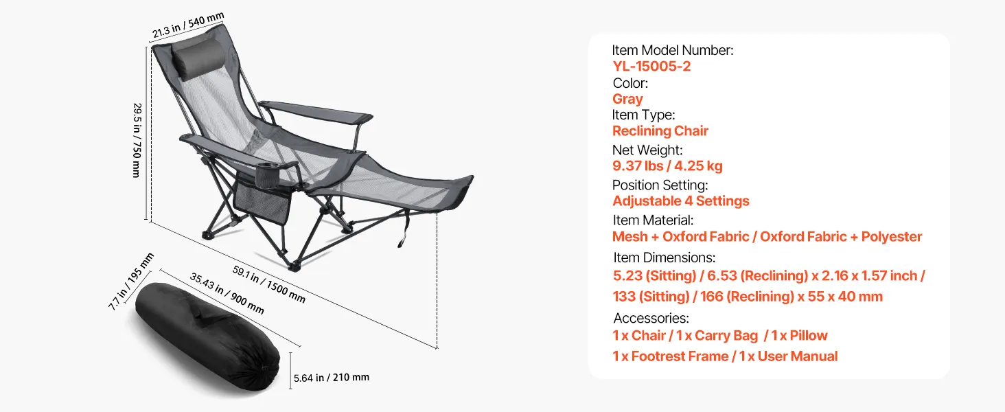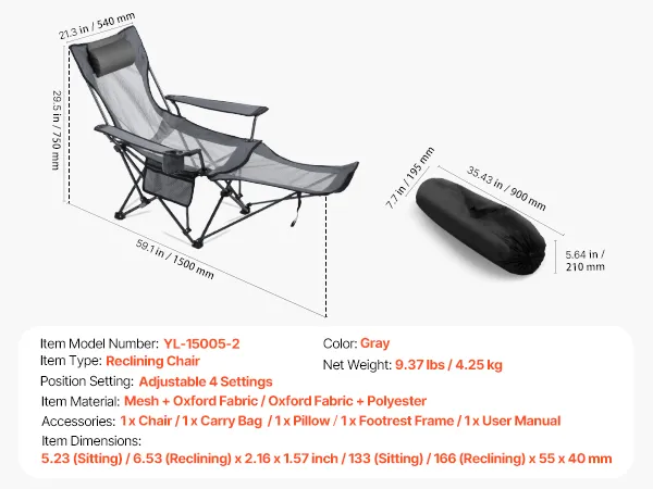 This foldable reclining chair measures 52.3 (seated) / 65.3 ft (reclined) x 21.6 x 15.7 in, offering generous space and lasting comfort. The iron frame supports up to 220 lbs. With a 4-position adjustable backrest, it helps relieve shoulder, neck, and arm fatigue for outdoor lounging, camping.