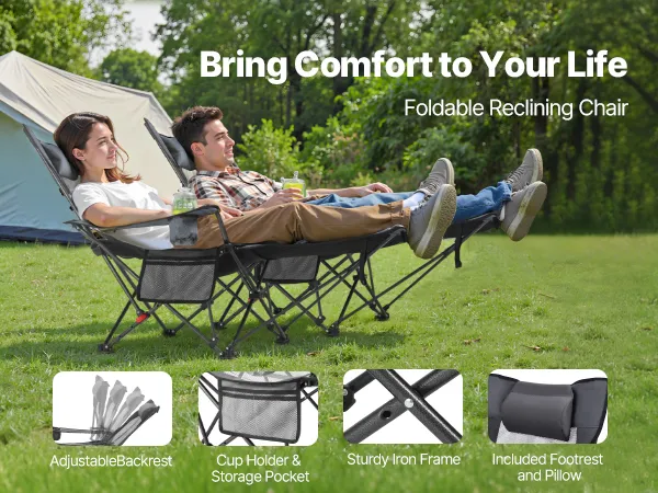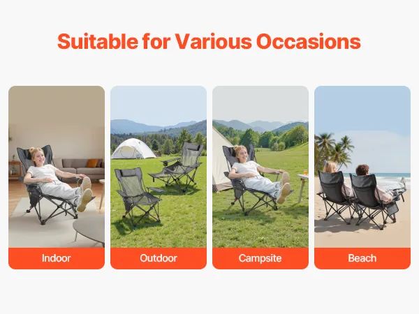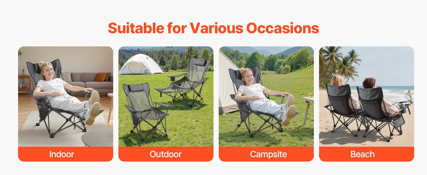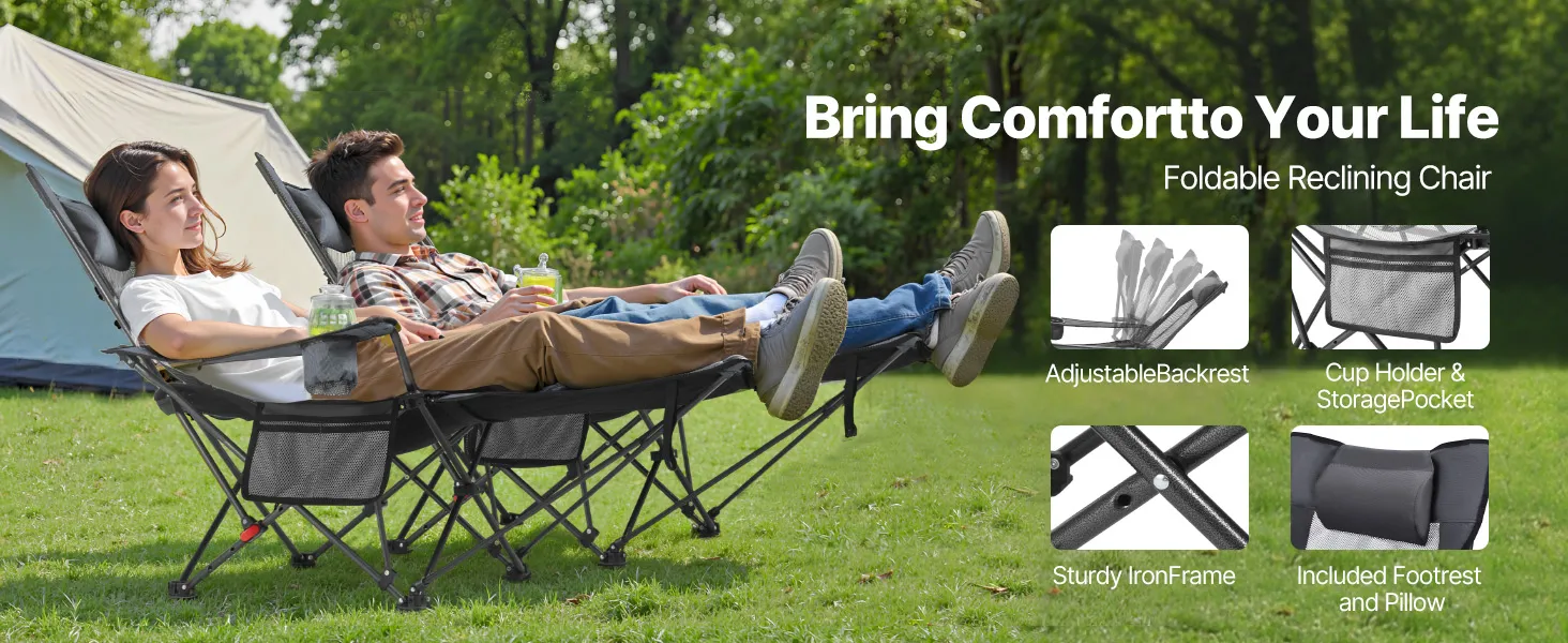 • Folds in Seconds: No tools required—just fold the reclining camping chair and go. Whether packing for a trip or storing at home, setup and takedown are quick and effortless, saving you time and hassle.