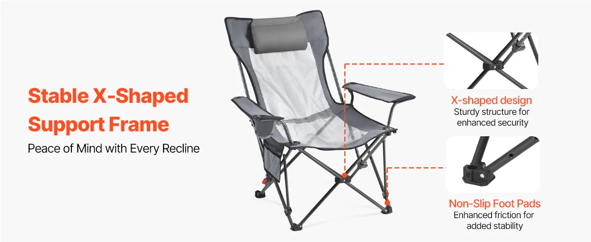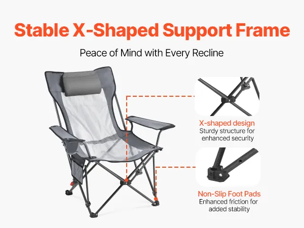 The X-shaped support structure evenly distributes weight to keep the chair steady and wobble-free. The folding reclining chair features non-slip feet that enhance ground grip, ensuring you feel stable whether sitting upright or fully reclined.
