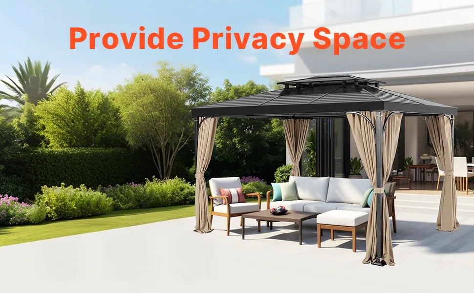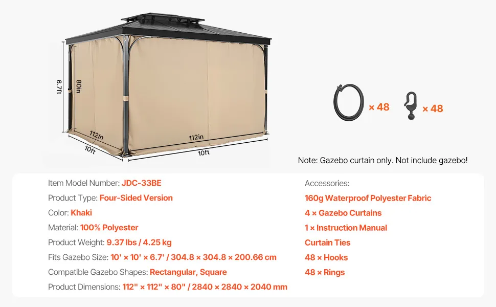 Designed for 10' x 10' x 6.7' gazebos, this gazebo curtain features waterproof 160gsm polyester. The double-sided zipper allows for easy adjustments, while aluminum grommets and a three-section tie design ensure quick installation and stable support, keeping your privacy intact.