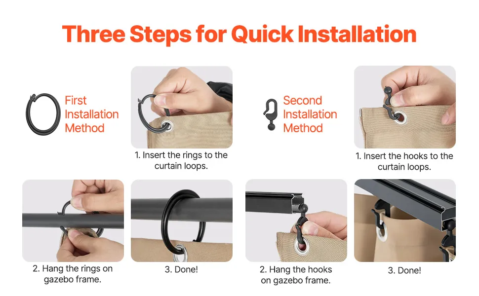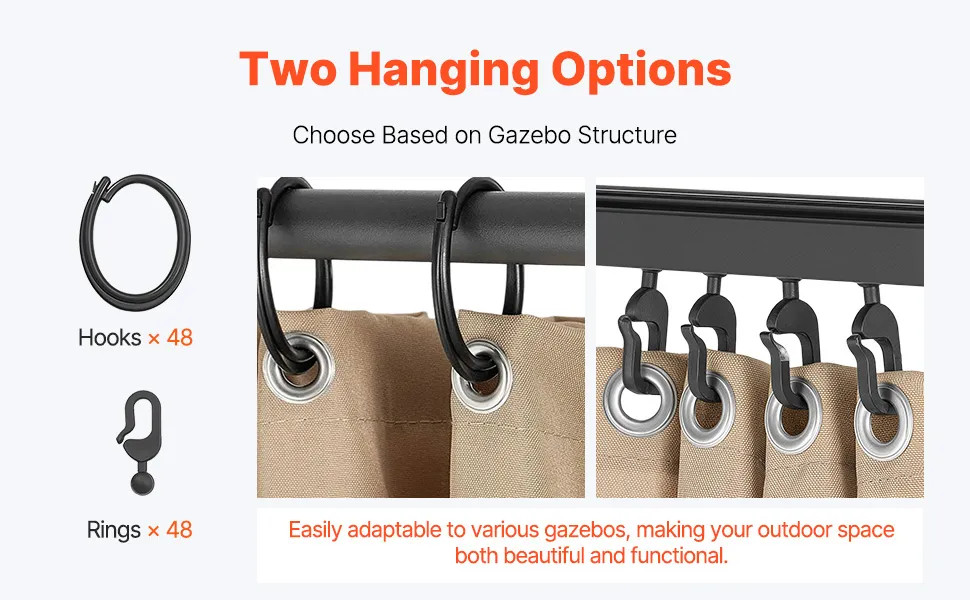 Aluminum Grommet Design: Featuring aluminum grommets, this outdoor gazebo curtain offers a durable hanging solution while simplifying the installation process. Whether using hooks or rings, the aluminum grommets ensure your curtains or other decorations are securely held in place.