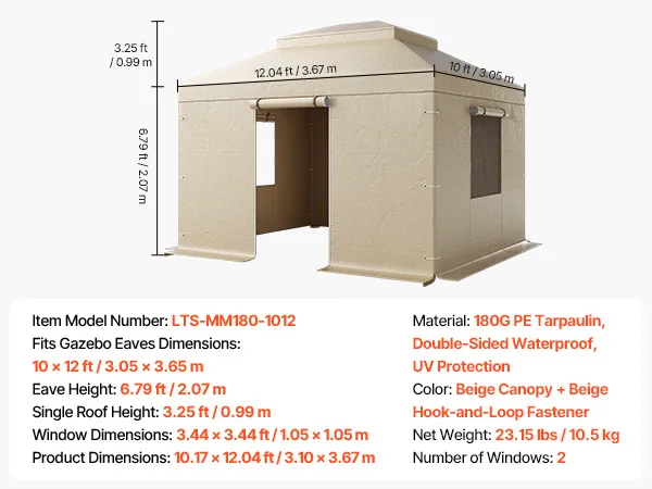 This winter replacement cover is designed for 10 x 12 ft double tiered gazebos. The 180G PE tarp with eaves for added protection. The dual-purpose mesh windows offer ventilation. The hook-and-loop fastener ensures easy installation. It's ideal for storing vehicles, sports gear, garden tools.