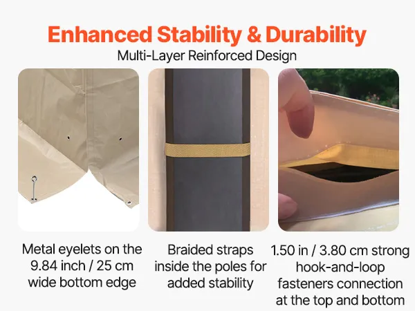 This universal winter cover for gazebos features a 9.84 in / 25 cm ground skirt with metal grommets to secures the base. Reinforced tie-down straps wrap around the posts, while 1.5 in / 3.8 cm heavy-duty hook-and-loop fasteners lock panels together for extra wind resistance and stability.