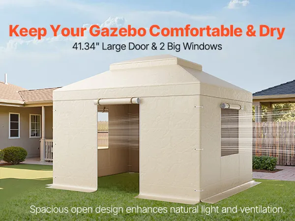 2-in-1 Windows and Spacious Door: Two 3.44 x 3.44 ft (1.05 x 1.05 m) windows feature outer flaps and inner mesh panels. Easily roll up the flaps with hook-and-loop closures to let fresh air in while keeping flies out. Close them to stay warm and dry. The gazebo cover for hardtop gazebos features a large 3.44 ft (1.05 m) door with ties for a wide entryway.