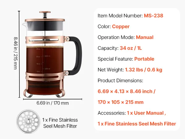 VEVOR French Press Coffee Maker, 1 Liter Borosilicate Glass Coffee Press Tea Maker with Stainless Steel Filter, Large Glass French Presses Cold Brew for Camping Travel Home Kitchen, Copper