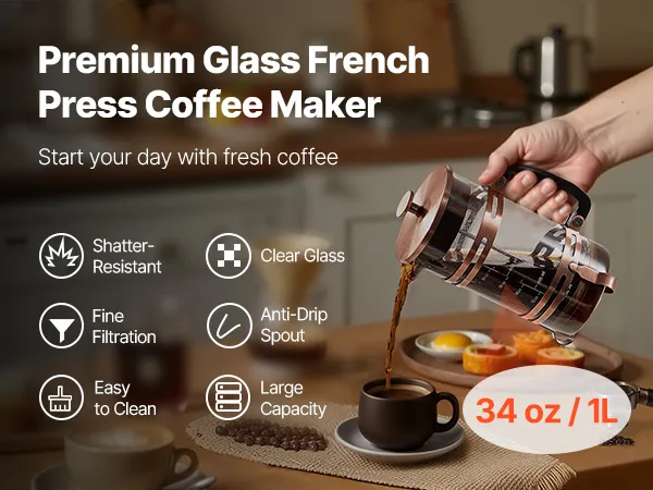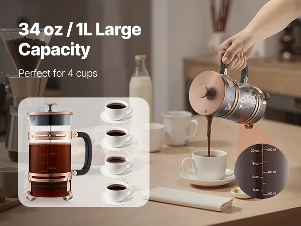 The French press coffee maker is crafted from premium borosilicate glass, providing excellent visibility to monitor your brew in real time. The anti-drip spout ensures smooth, mess-free pouring every time.