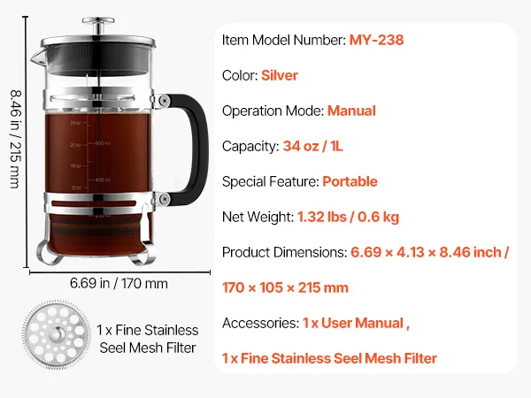 Precision Filtration System: Our coffee press features a fine filtration system with a 304 stainless steel spiral plate, mesh filter, and cross plate. It effectively removes coffee grounds for a smooth taste