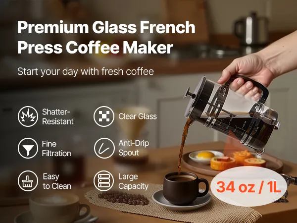 The French press coffee maker is crafted from premium borosilicate glass, providing excellent visibility to monitor your brew in real time. The anti-drip spout ensures smooth, mess-free pouring every time.