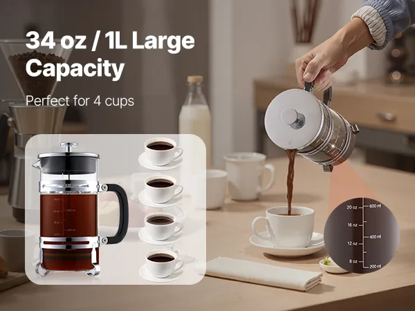 Versatile & Portable Design: More than coffee—brew tea, cold brew, or frothed milk with this 34 oz / 1L silver French press. Compact yet generous in capacity, ideal for home, office, camping, or sharing with friends and family