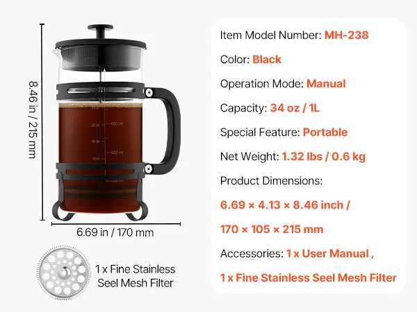 Precision Filtration System: Our coffee press features a fine filtration system with a 304 stainless steel spiral plate, mesh filter, and cross plate. It effectively removes coffee grounds for a smooth taste