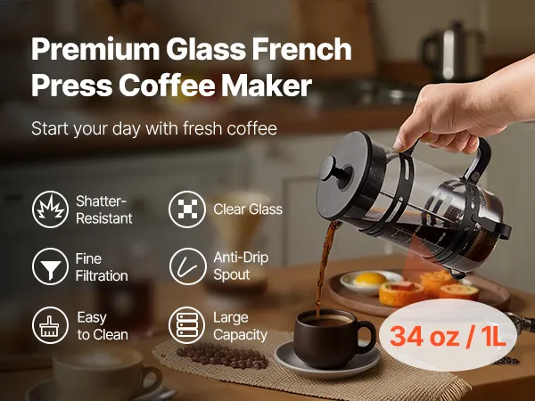 The French press coffee maker is crafted from premium borosilicate glass, providing excellent visibility to monitor your brew in real time. The anti-drip spout ensures smooth, mess-free pouring every time.