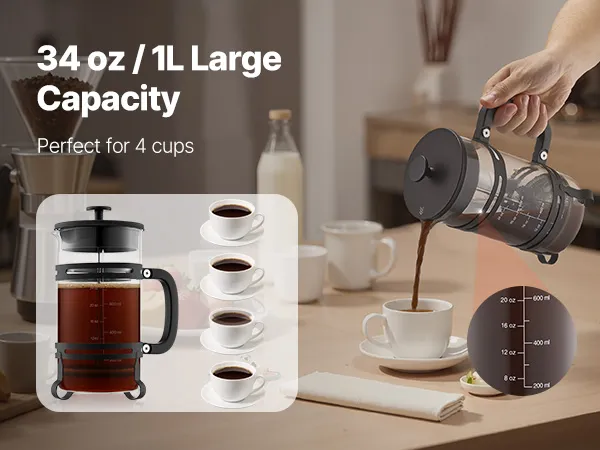Brew for a group with this generously sized coffee French press. The clear measurement markings make it easy to adjust your brew volume based on your needs—perfect for gatherings and daily use.
