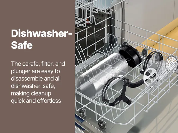 Easy to Clean: This French coffee press features a smooth glass surface, removable filter and plunger for effortless cleaning. All parts disassemble easily for deep cleaning and are fully dishwasher-safe