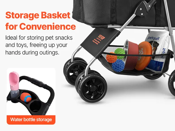 Detachable Carrier for Easy Travel: The dog stroller with detachable basket that easily secures to your car seat, providing a secure and cozy space for your pet during long trips. Keeps pets secure and comfortable on the road. The storage compartment ideal for holding pet snacks and toys.