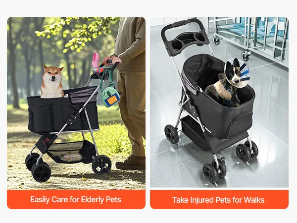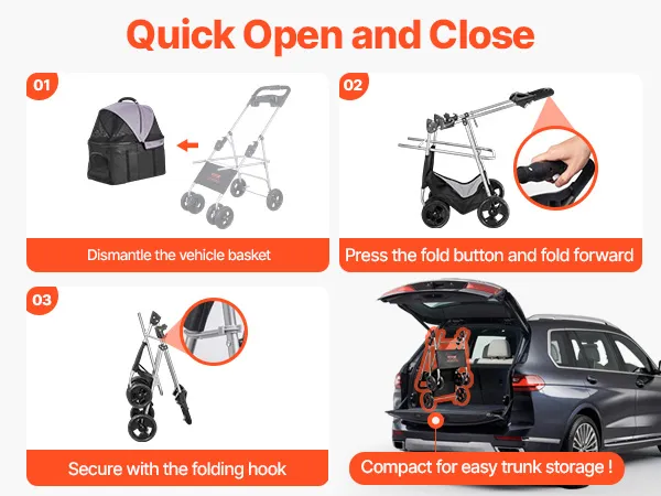 Quick One-Hand Fold: Effortlessly fold the pet stroller for dogs with a single hand for compact storage. It fits easily into your car trunk or small spaces at home, ideal for travel, outings, or daily use.