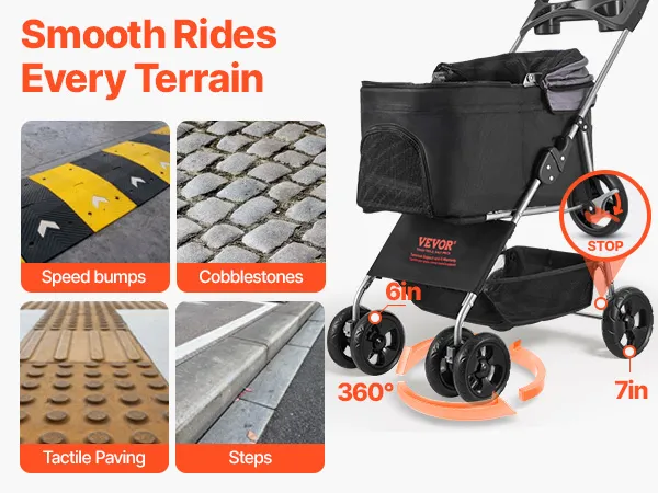 Smooth and Stable Mobility: Featuring 6-inch EVA foam wheels for shock absorption, this foldable pet stroller offers versatility across grass, sidewalks, and sand. A 360° rotating front wheel ensures easy navigation, while rear brakes provide security during stops.