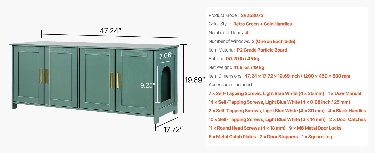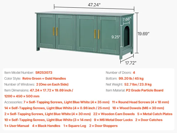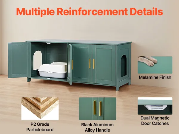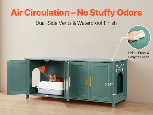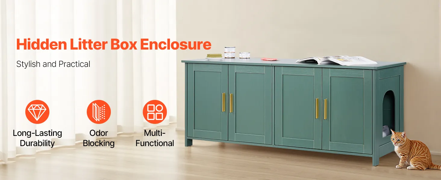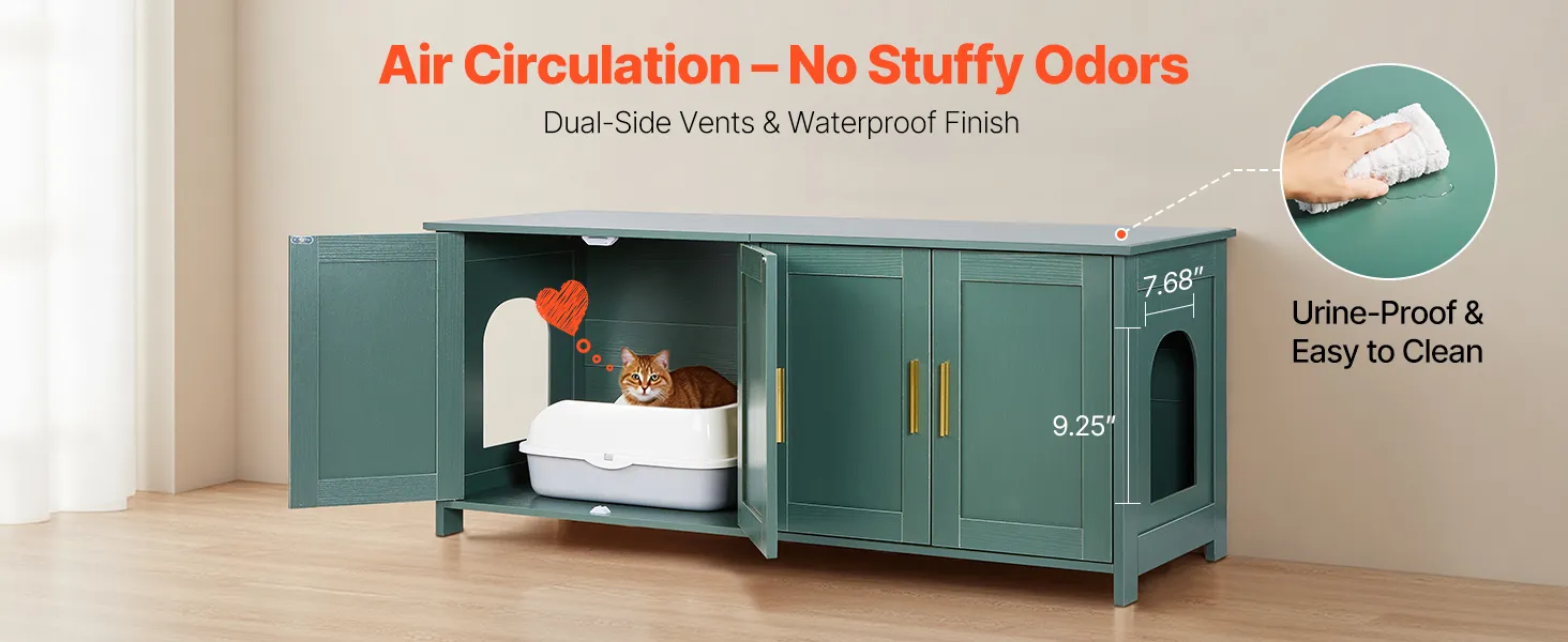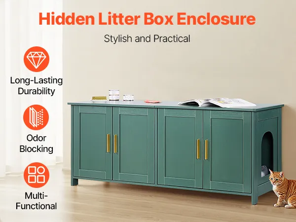 Stylish & Multi-Functional: Our cat litter box enclosure with elegant green colored body, and golden aluminum handles, make it vintage and stylish. The sturdy and heavy-loading top can double as a cat bed, storage cabinet, or side table. One litter box enclosure, seamlessly blends with various home decoration styles while saving space.