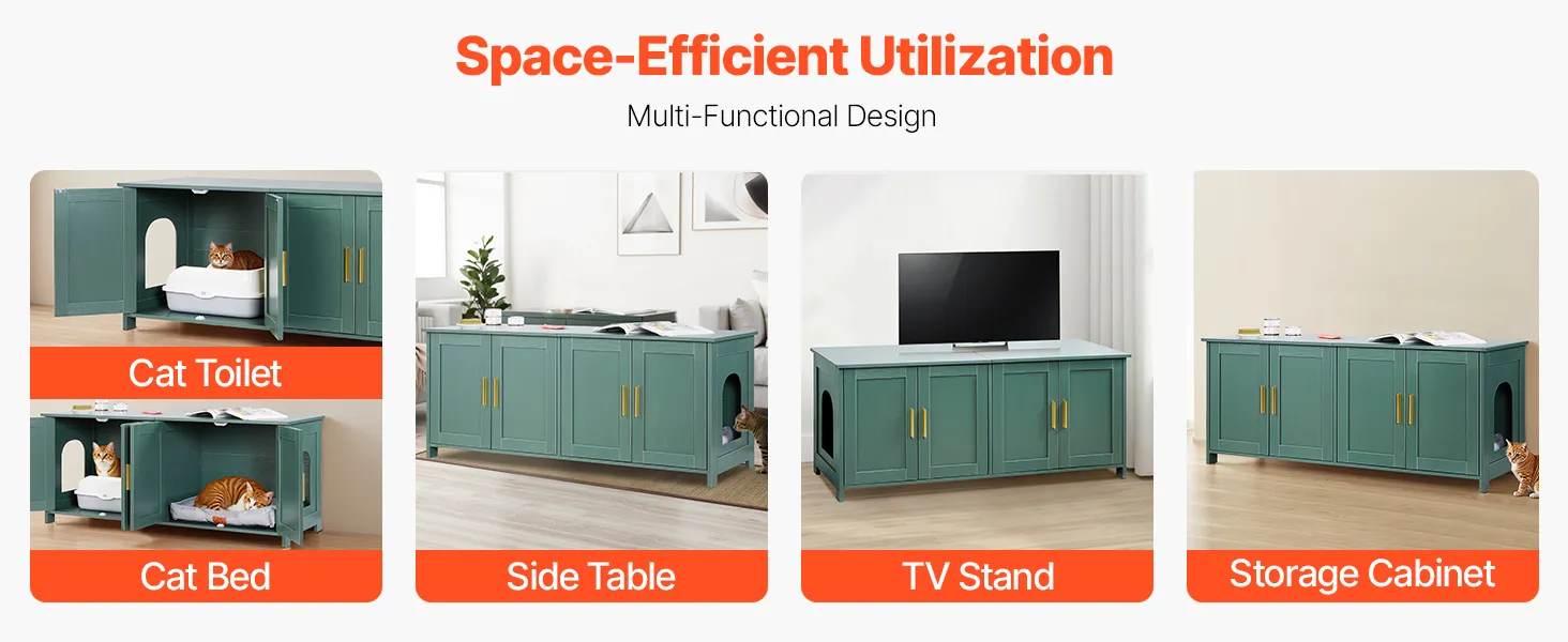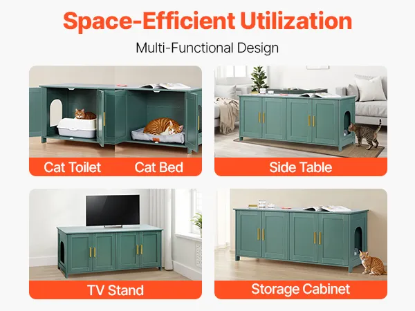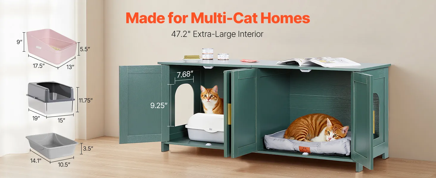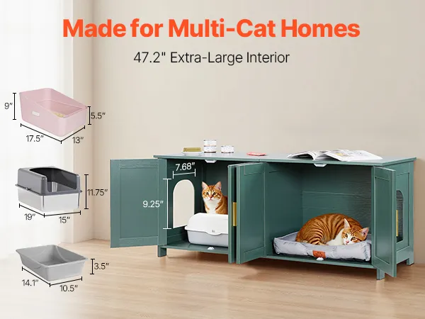 Measuring 47.24 × 17.72 × 19.69 in, the roomy interior accommodates various litter box sizes and cat beds. This wooden litter box enclosure is ideal for multi-cat homes, it offers more freedom of movement to reduce conflicts and improve litter box acceptance.