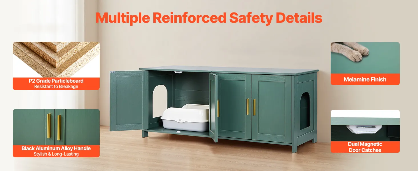 Made with P2-grade safe, durable panels, a metal latch, and aluminum alloy handles. The melamine finish is scratch-resistant, waterproof, and easy to clean. Magnetic door closures keep the cabinet securely shut, preventing cats from opening it and containing odors.