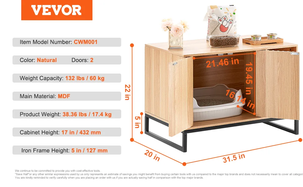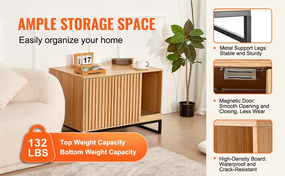 Made from high-density MDF board and supported by sturdy metal legs, the cat box enclosure furniture with 2 doors ensures durability and stability. Its robust construction allows you to safely place various items on top, with a maximum weight capacity of 132 lbs (60 kg).