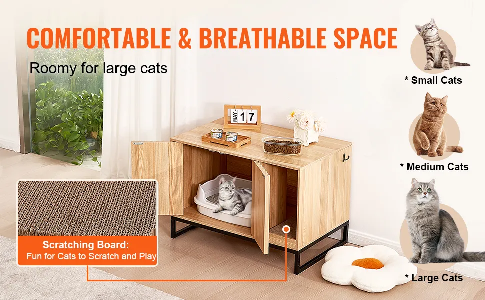 With 31.5"L x 20"W large, comfortable size suitable for small to large cats, the wooden cat box cabinet features ventilation hole to ensure proper airflow. It also includes a scratching board, allowing your cat to play while enjoying its space.