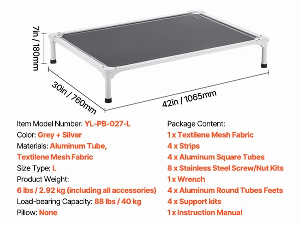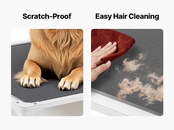 Breathable Mesh Fabric: High-quality mesh ensures constant airflow, keeping your pet cool and comfortable while resting. Sensitive areas like the belly and underarms stay fresh. With waterproof and oil-resistant features, cleaning is hassle-free. The elevated dog bed is machine washable, avoiding hair buildup, promoting your pet's skin health and making maintenance easier