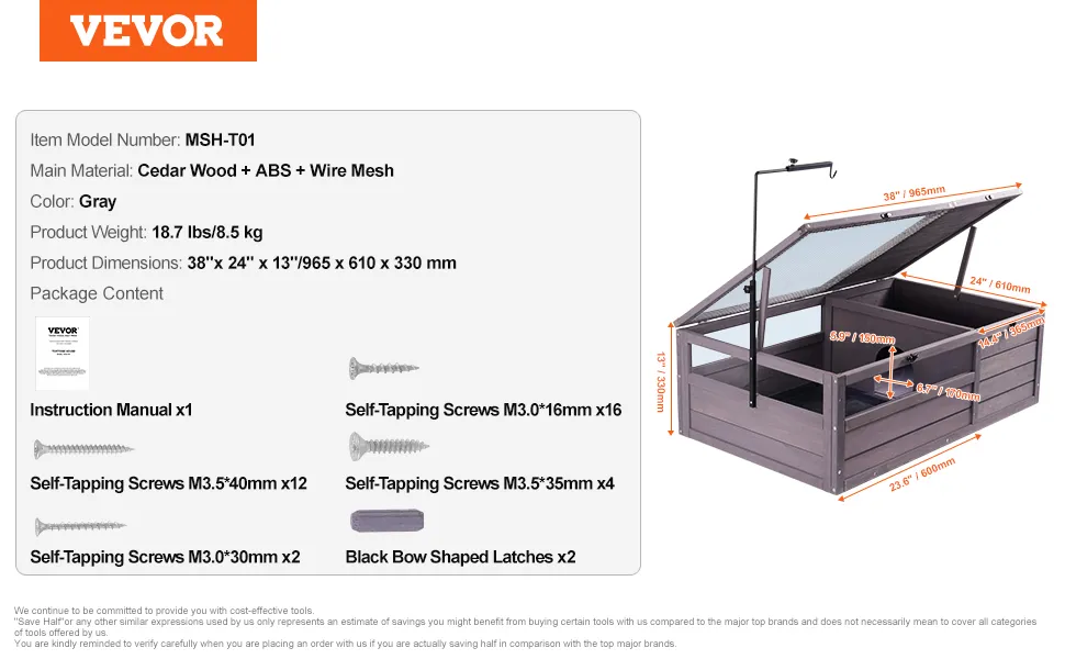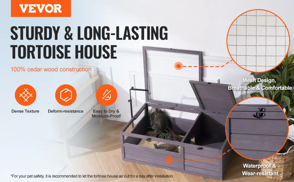 100% Cedar Construction: Crafted from high-quality cedar wood, this tortoise habitat is sturdy and durable with a tight grain that resists warping. Coated with water-based paint, it is waterproof, ensuring a safe and comfortable living environment for your pet.