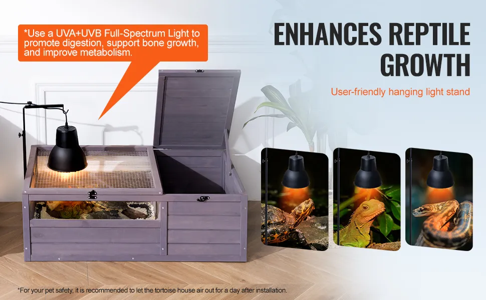 Equipped with a hanging lamp holder that can rotate 360°, with adjustable height and length, allowing precise control of the tortoise habitat's temperature and UVA + UVB intake. This ensures your tortoise or other reptiles receive the necessary light for healthy growth, even indoors.
