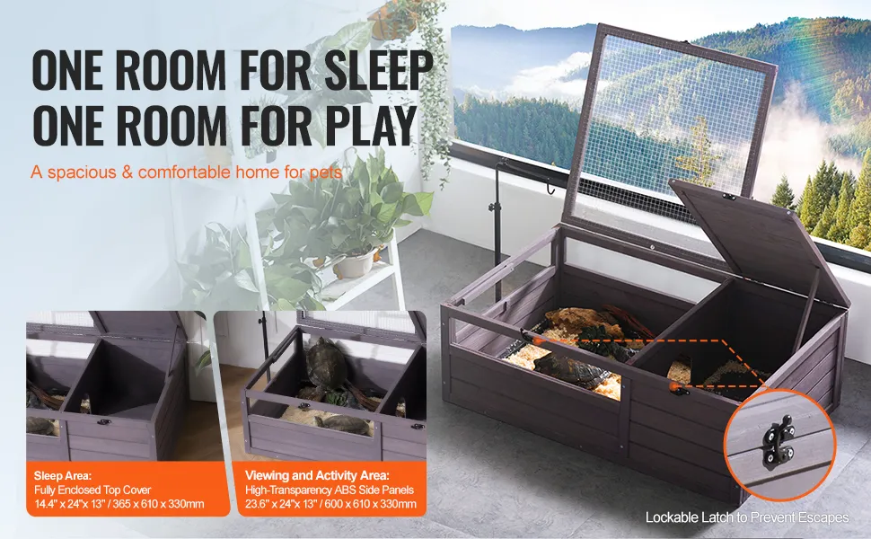 With a generous 38"x24"x13" space, the tortoise enclosure includes a private sleeping area with a top and a public viewing area with a high-transparency ABS side panel. The lockable top cover with a high-density mesh effectively prevents pets from escaping. Suitable for various small animals.
