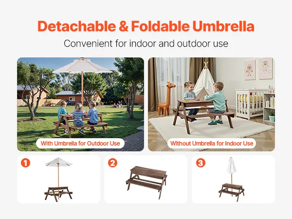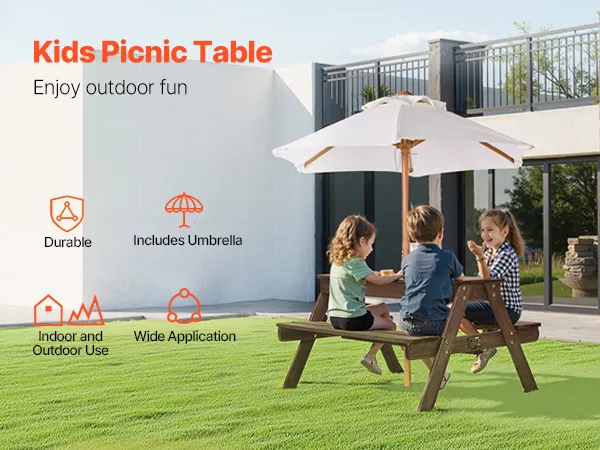 VEVOR Kids Picnic Table with Umbrella, 3-in-1 Sand & Water Table, Outdoor Wooden Table and Bench Set with 2 Trays, 4-People Patio Dining Furniture for Garden, Backyard and Porch (Walnut)