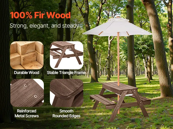 Premium Fir Wood: The picnic table is crafted from high-quality fir wood, known for its hardness, resistance to cracking, and deformation. With its natural beauty and fine grain texture, the material ensures excellent stability. Its superior weather and rot resistance effectively gaurd against outdoor environmental impacts, making it ideal for long-term use