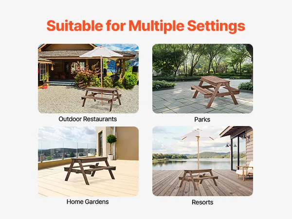 Multi-Scene Application: This outdoor picnic table adapts to a variety of environments, including parks, campsites, resorts, outdoor restaurants, schools, home gardens, and patios. It offers a fun and comfortable dining space