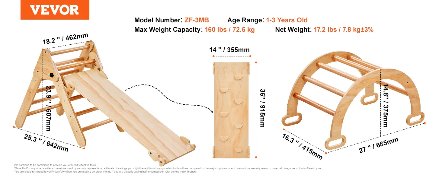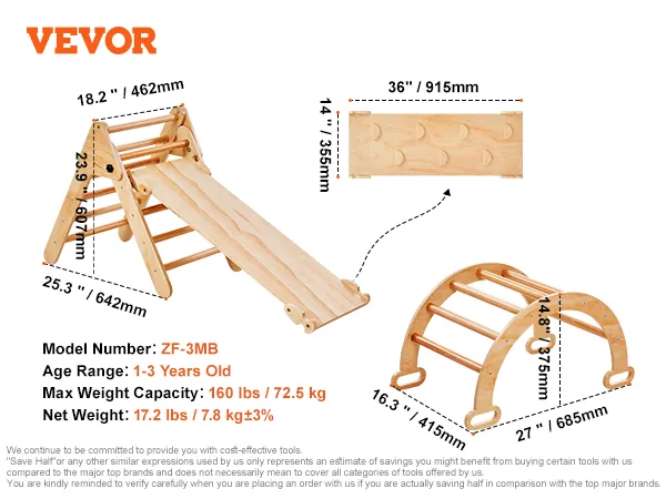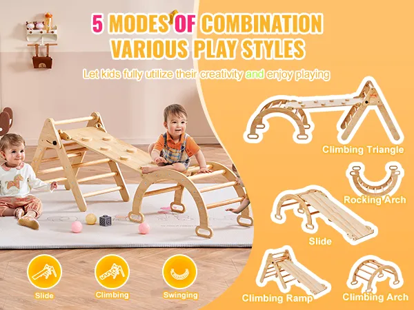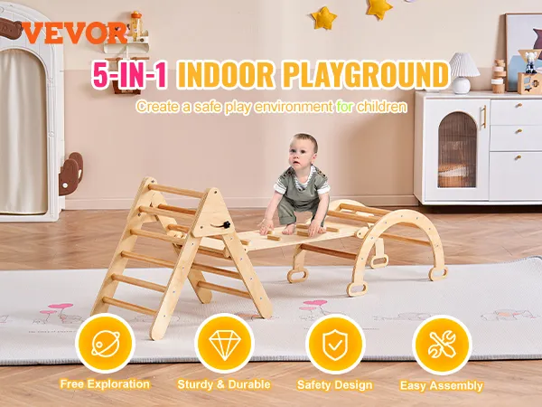 This VEVOR pikler triangle set includes a triangle climber, a heavy-duty ramp, and an arch. You can combine these elements in five different configurations to create a dynamic indoor playground for toddlers. Designed to promote independence, balance, and confidence, this Montessori climbing set is ideal for children aged 1-3. Its ramp is versatile, serving both as a climbing structure and a sliding surface. You can also configure the set as a cradle by using the quadruple or pikler elements. Whether used in the home or educational settings, this set provides a safe and engaging environment for children to explore and learn.