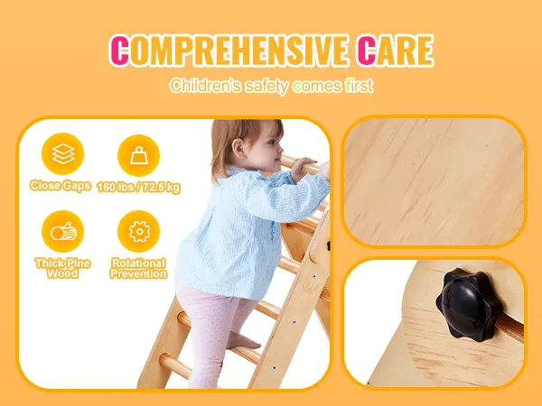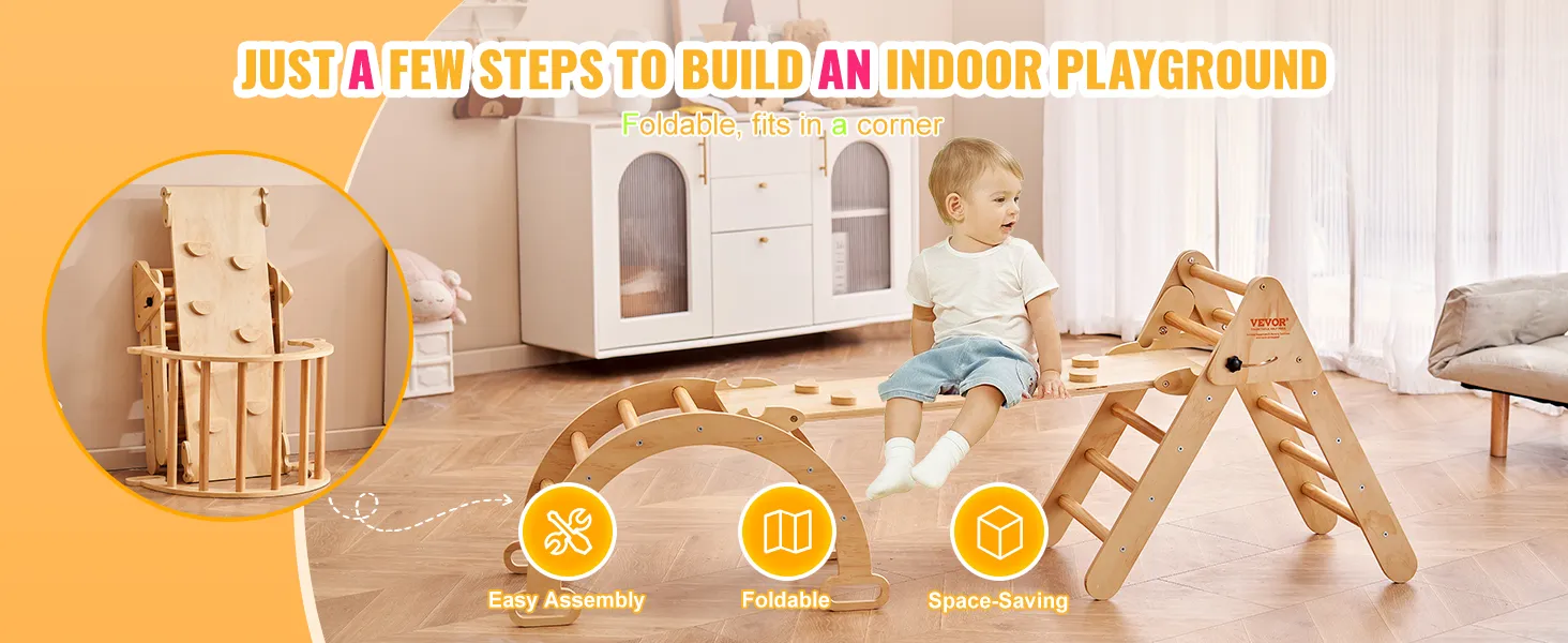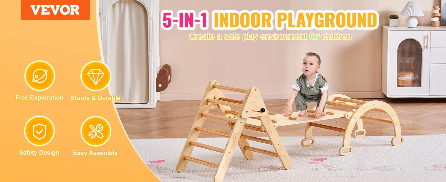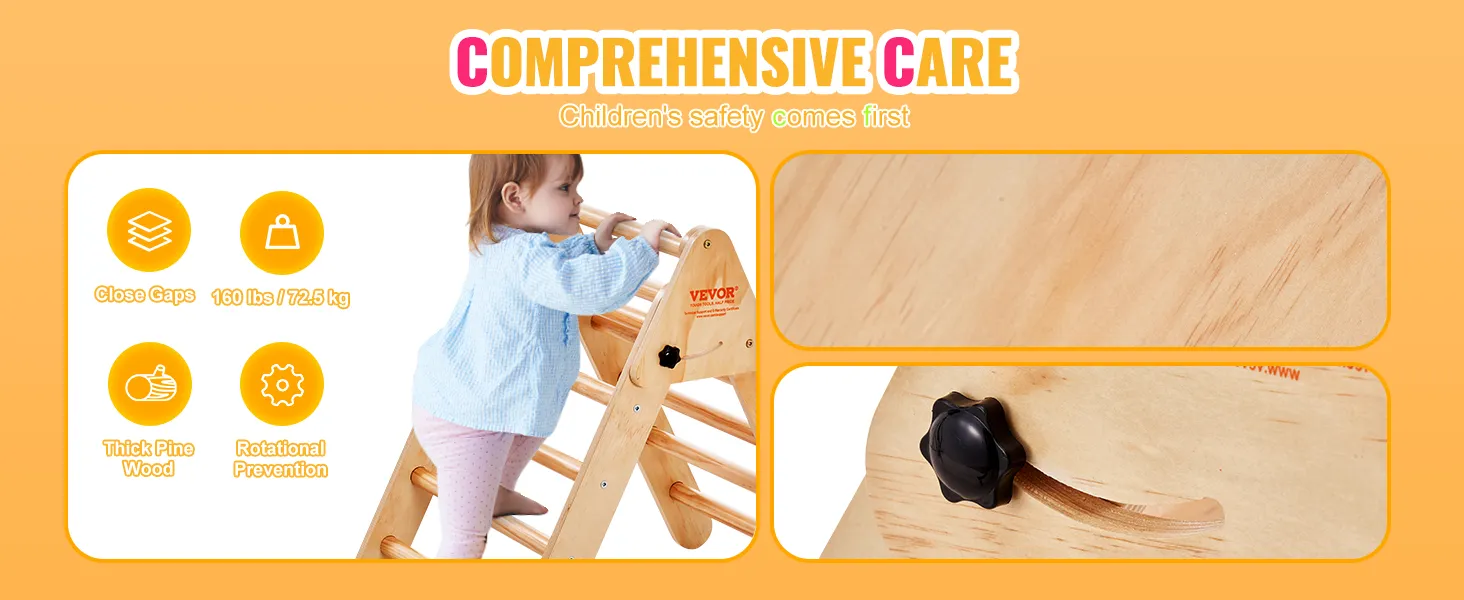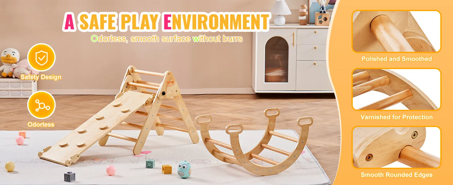 This VEVOR pikler triangle set includes important safety upgrades to ensure secure climbing. Its round wooden rods feature rotational prevention, keeping the structure stable during play. Additionally, the close spacing of the climbing bars reduces the risk of accidents. These features are essential for ensuring that children can enjoy climbing and sliding with minimal risk, making this indoor playground for toddlers a safe choice for your home or classroom.