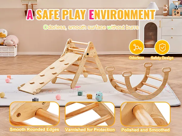 Safety is a top priority in the design of this Montessori climbing set. The set's polished, varnished, and burr-free wood surface offers toddlers a smooth, odorless play area. Rounded edges further reduce the risk of injury, ensuring a comfortable and safe environment for children to play, climb, and explore. Designed with the needs of toddlers in mind, this set allows for confident and independent play while minimizing any potential hazards.