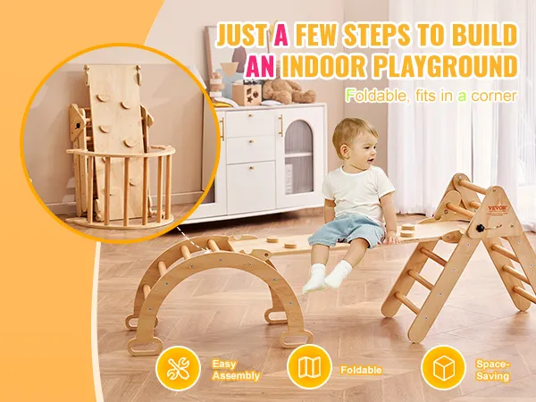 Parents can easily assemble the VEVOR pikler triangle set thanks to its clearly labeled parts and intuitive manual. The triangle climber's adjustable angle enables you to fold and store the entire set in a corner, providing an ideal space-saving solution. Whether in a home or educational setting, busy families can easily disassemble and store this wooden climbing gym when not in use, offering flexibility and convenience.