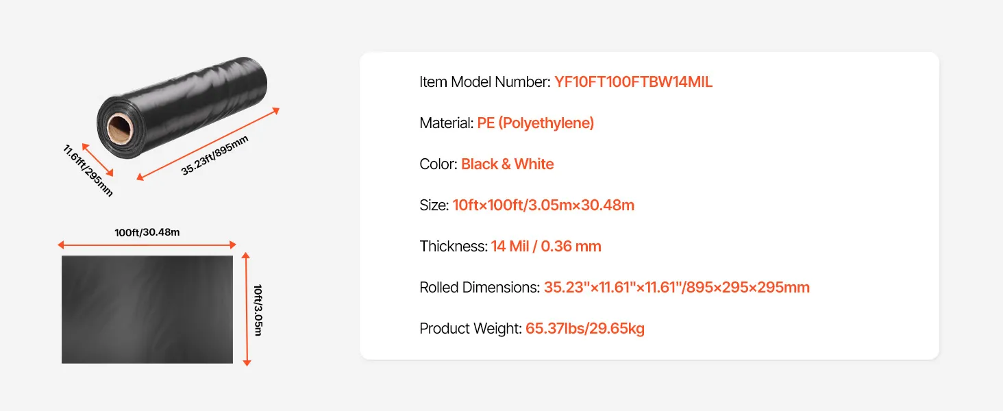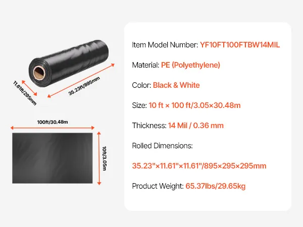 This 14mil/0.35mm thickened heavy duty plastic sheeting for tear resistance and durability. Measuring 10ftx100ft (3.05m x 30.48m), the large size plastic sheeting covers extensive areas. Dual-sided black-white design for light reflection, blocking, and moisture control, ideal for building needs.