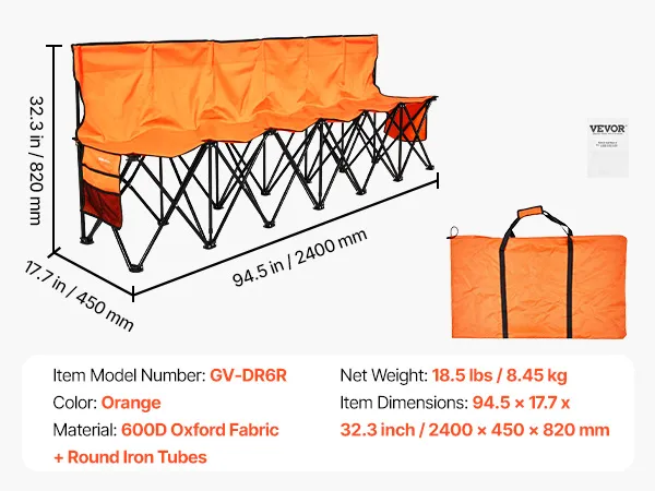 Secure and Stable: This team bench is made of premium 600D oxford fabric, offering both strength and comfort. The foldable seating features Ø16 mm iron tubes with a 1 mm wall thickness, ensuring durability and a stable metal frame structure
