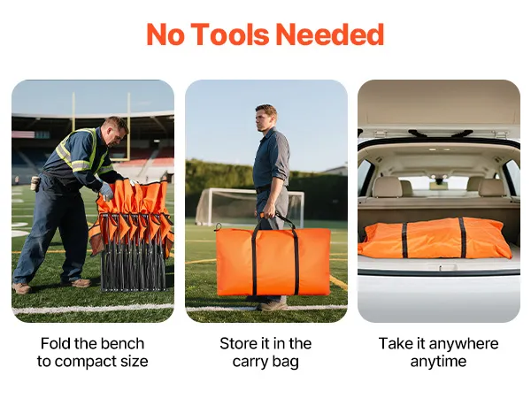Easy to Fold and Move: Our soccer bench seating is simple to transport, and its efficient storage design maximizes space utilization. Ideal for outdoor and indoor settings—sports fields, parties, gatherings, or commercial venues—it can be set up in just seconds for instant seating